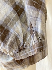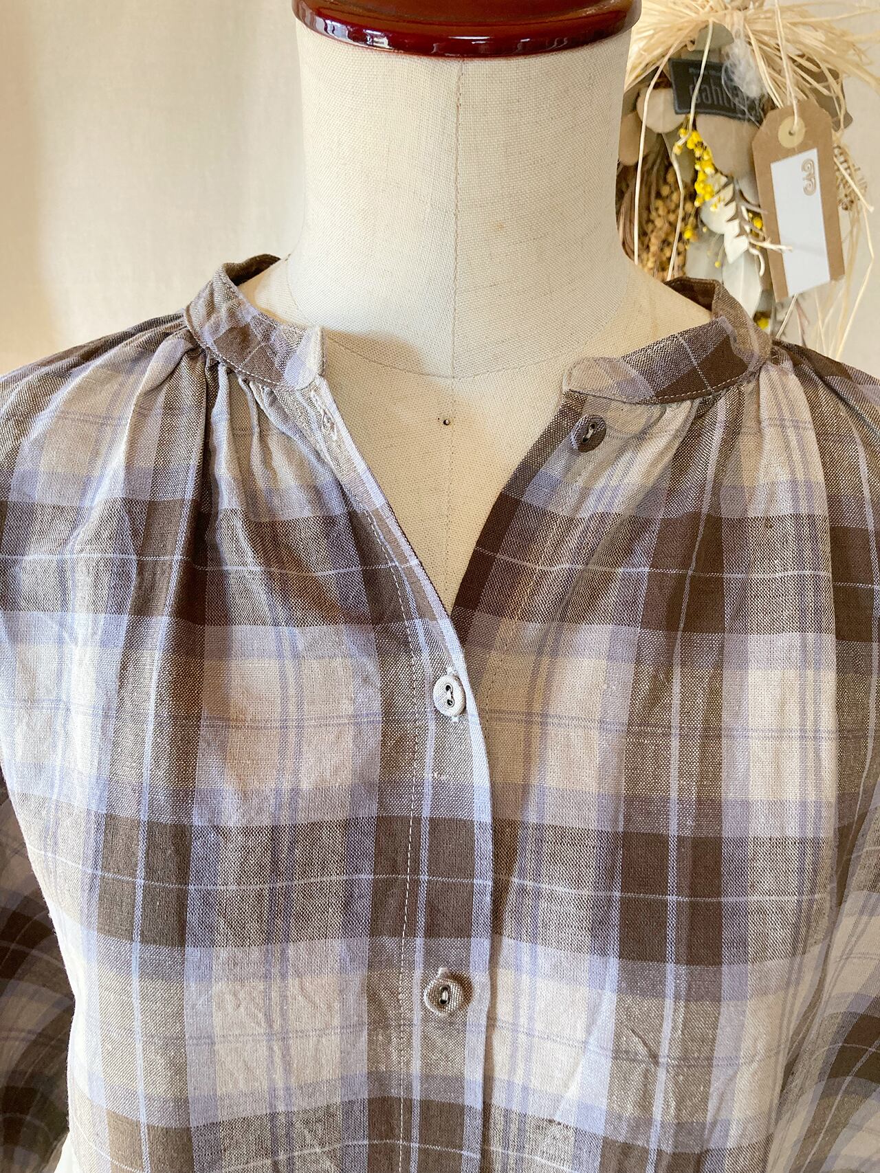 コットンリネン素材のブラウンxグレーベージュxラベンダーの落ち着いた少し大人なチェック素材です。